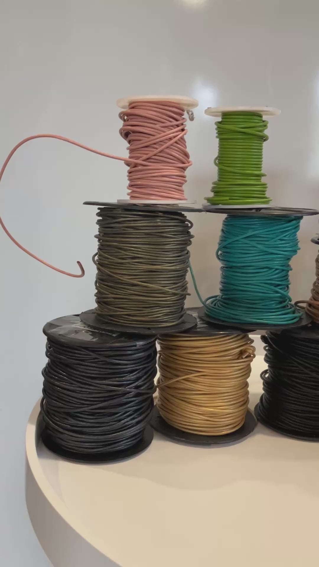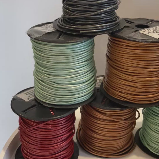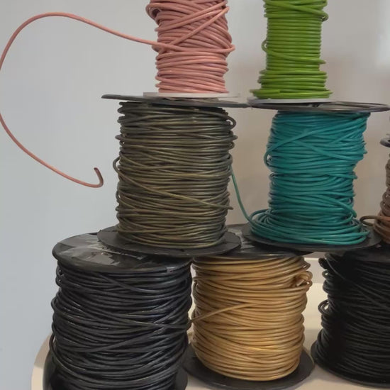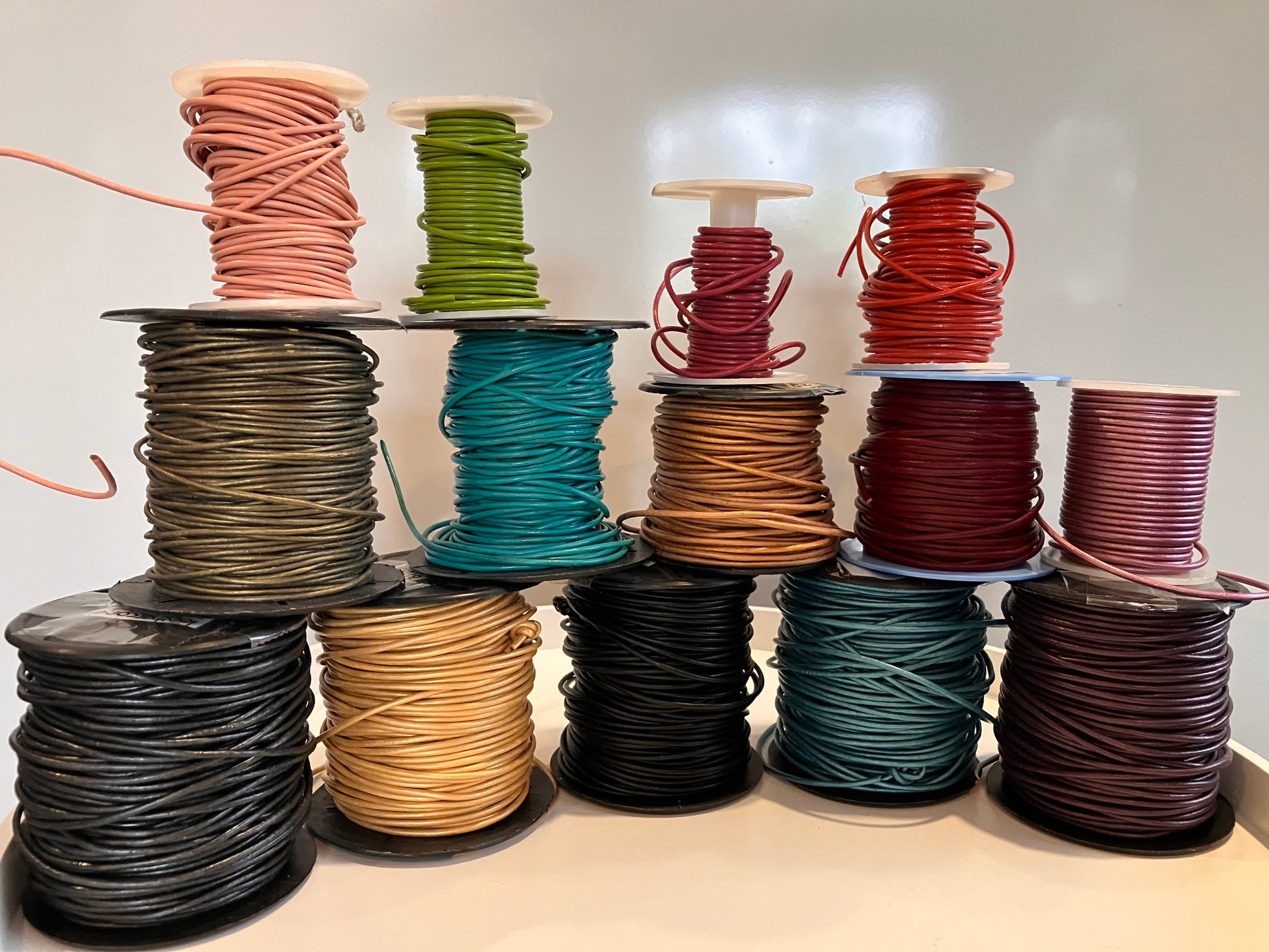 Bulk lot of 2mm Round Leather Cord. Contains 18 large spools and 8 smaller spools. Valued at over $800.