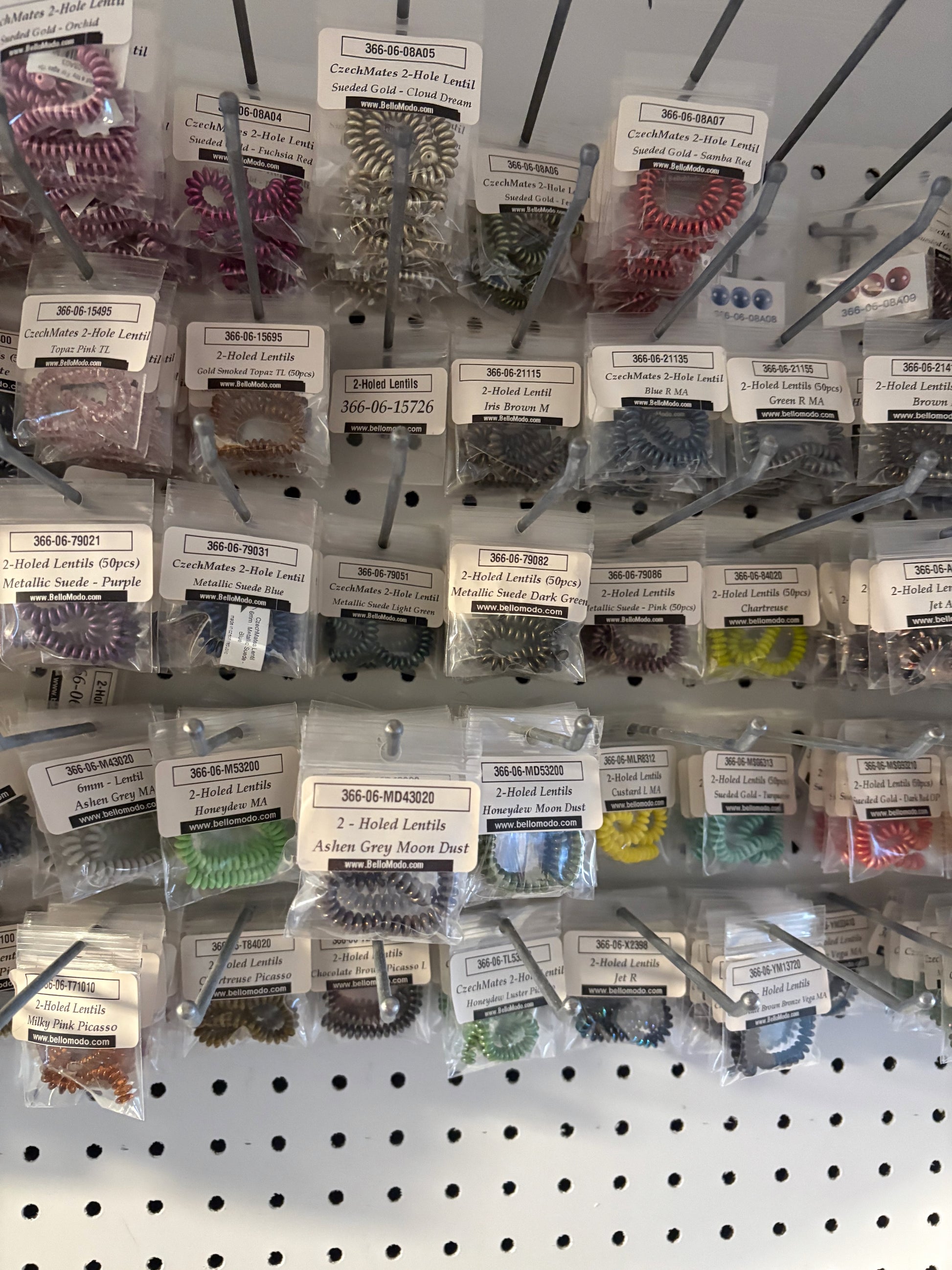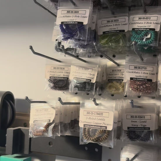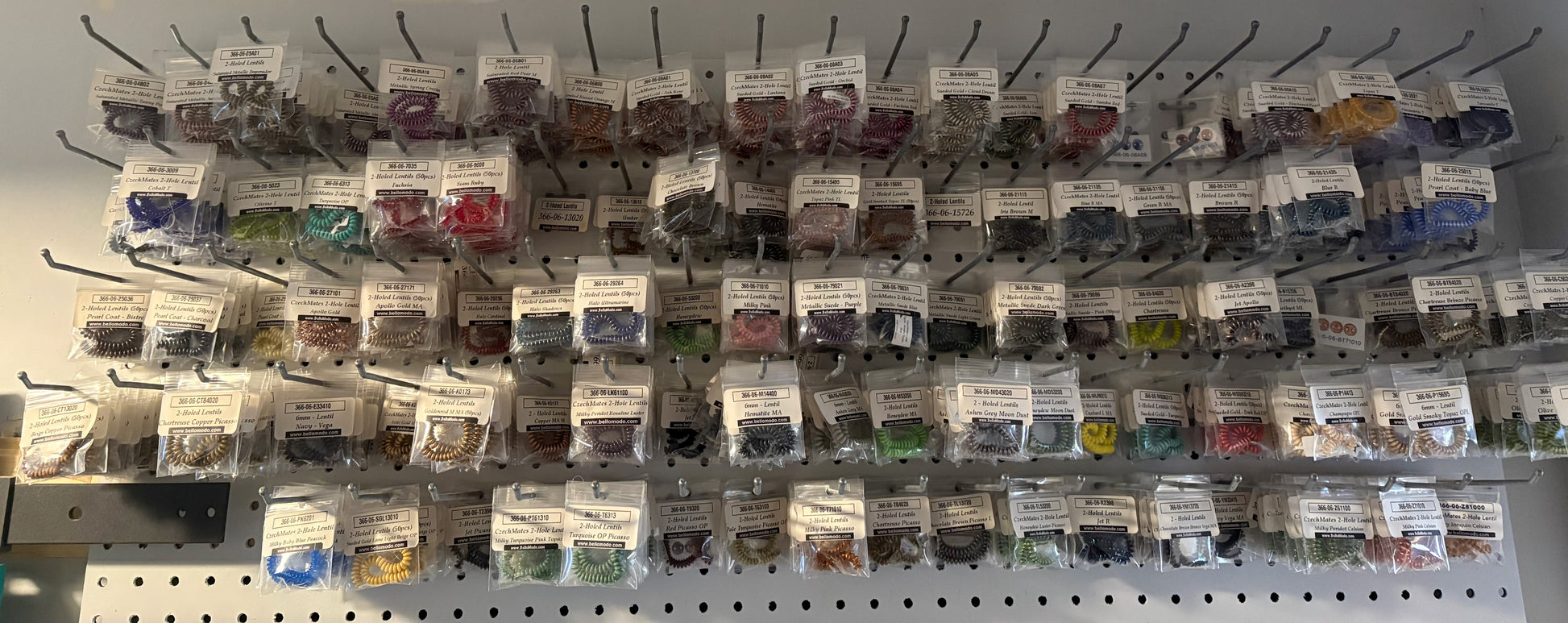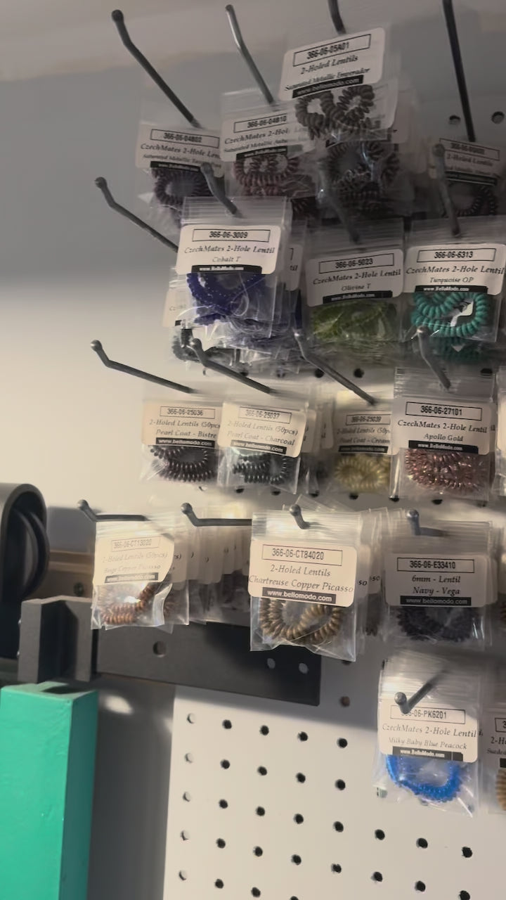 Bulk lot of all remaining CzechMates 2-Hole Lentils. Approximately 758 packaged items in 92 different colors and finishes, valued at over $3,000.