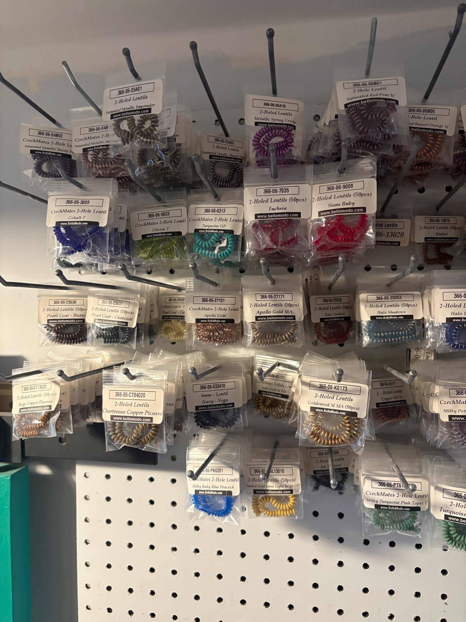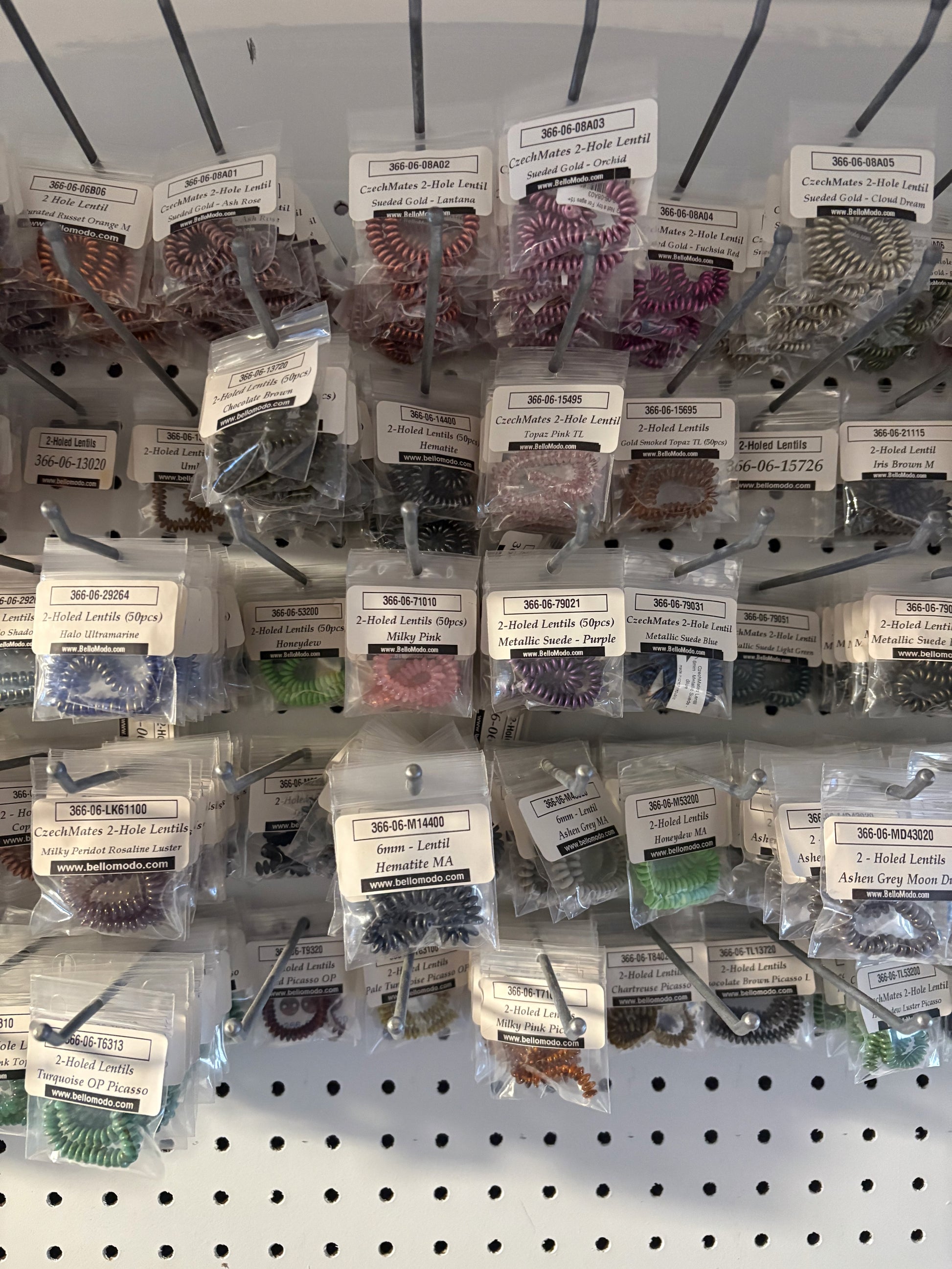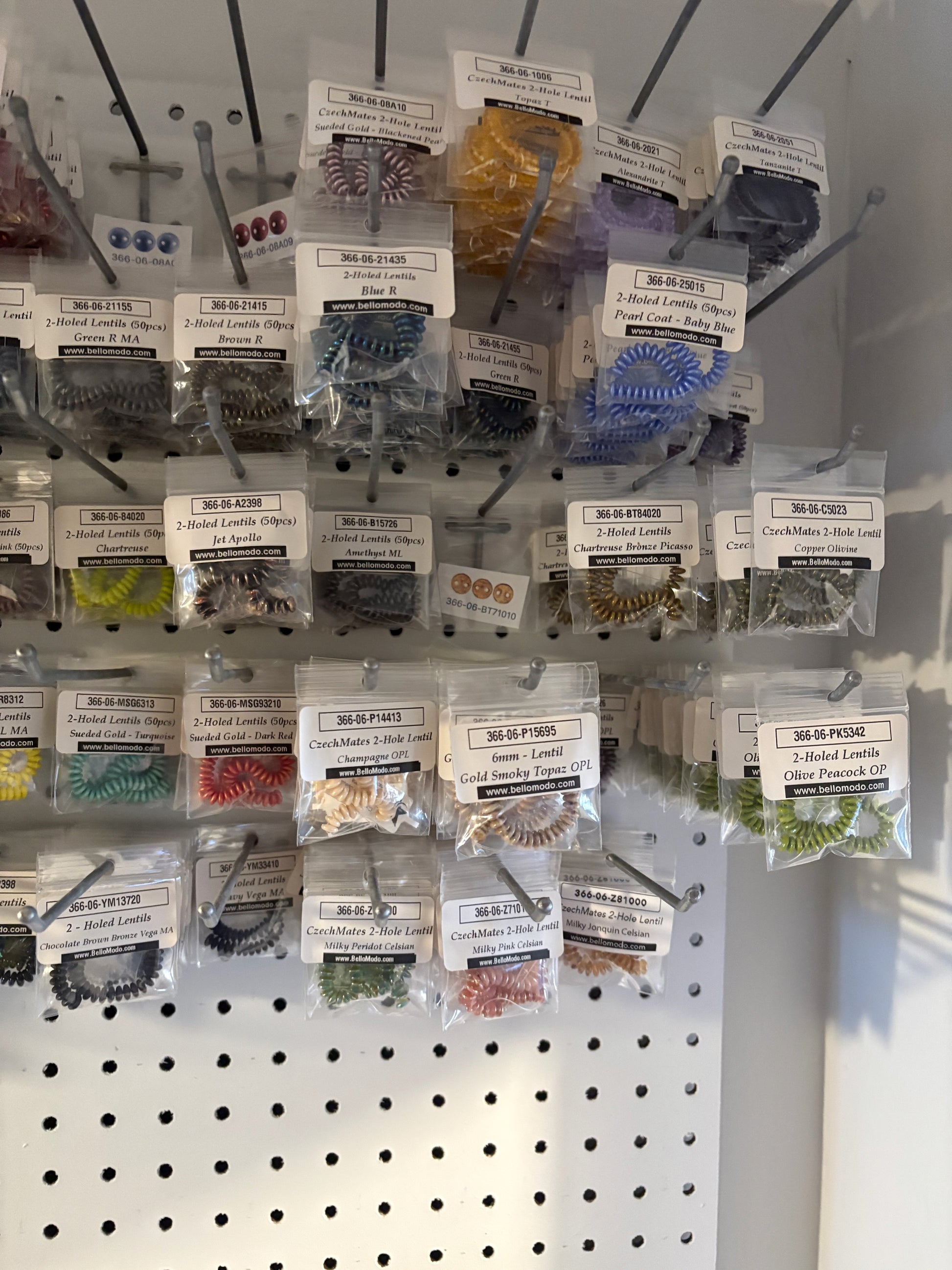 Bulk lot of all remaining CzechMates 2-Hole Lentils. Approximately 758 packaged items in 92 different colors and finishes, valued at over $3,000.