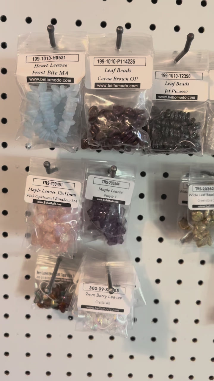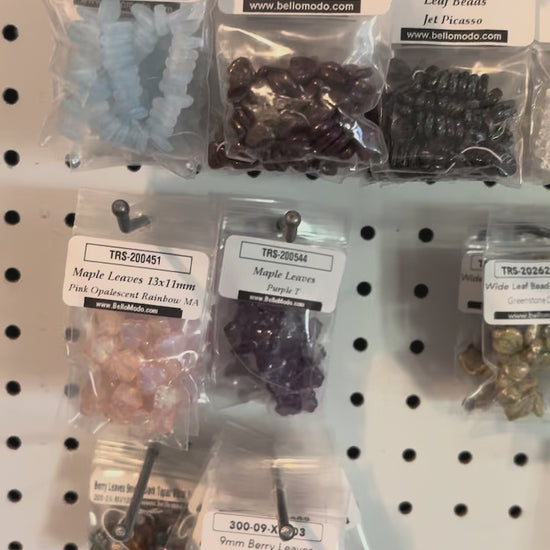 Bulk lot of some Leaf Shaped Beads. This lot includes Heart Leaves, Maple Leaves, Wide Leaf Beads, Berry Leaves and Lampwork Leaves. Approximately 101 packaged items in 21 different colors and shaped, valued at over $500.